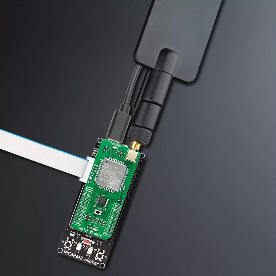 PWRKEY按钮不能持续按下,否则模块无法进入省电模式。黄灯标记为CONNECT,用于指示设备的运行状态。NB IoT 2 Click使用UART接口作为其默认通信协议,用户也可以选择使用其他接口(如SPI)来配置模块并自行编写库。它支持自动波特率检测,默认配置下的运行速率为115200 bps,用于数据传输和与主机MCU交换AT命令。此外,BC66-NA使用了连接到mikroBUS™插座的两个GPIO引脚。WUP引脚连接到mikroBUS™的INT引脚,代表外部中断引脚,用于从省电模式唤醒设备;mikroBUS™插座上的RST引脚可以通过将该引脚置于低电平来执行硬件复位功能。此Click板™还配备了一个微型USB接口,允许通过个人计算机为模块供