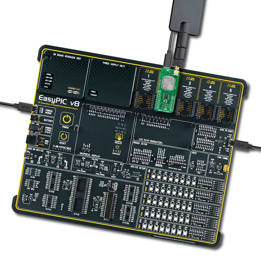 PWRKEY按钮不能持续按下,否则模块无法进入省电模式。黄灯标记为CONNECT,用于指示设备的运行状态。NB IoT 2 Click使用UART接口作为其默认通信协议,用户也可以选择使用其他接口(如SPI)来配置模块并自行编写库。它支持自动波特率检测,默认配置下的运行速率为115200 bps,用于数据传输和与主机MCU交换AT命令。此外,BC66-NA使用了连接到mikroBUS™插座的两个GPIO引脚。WUP引脚连接到mikroBUS™的INT引脚,代表外部中断引脚,用于从省电模式唤醒设备;mikroBUS™插座上的RST引脚可以通过将该引脚置于低电平来执行硬件复位功能。此Click板™还配备了一个微型USB接口,允许通过个人计算机为模块供